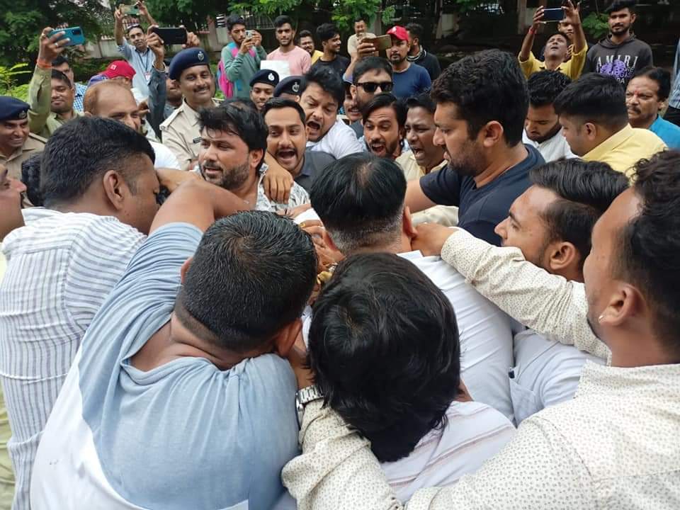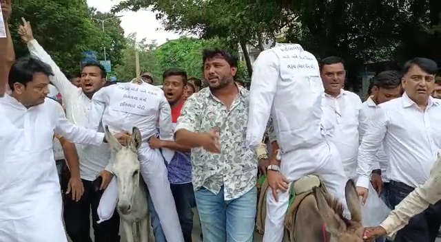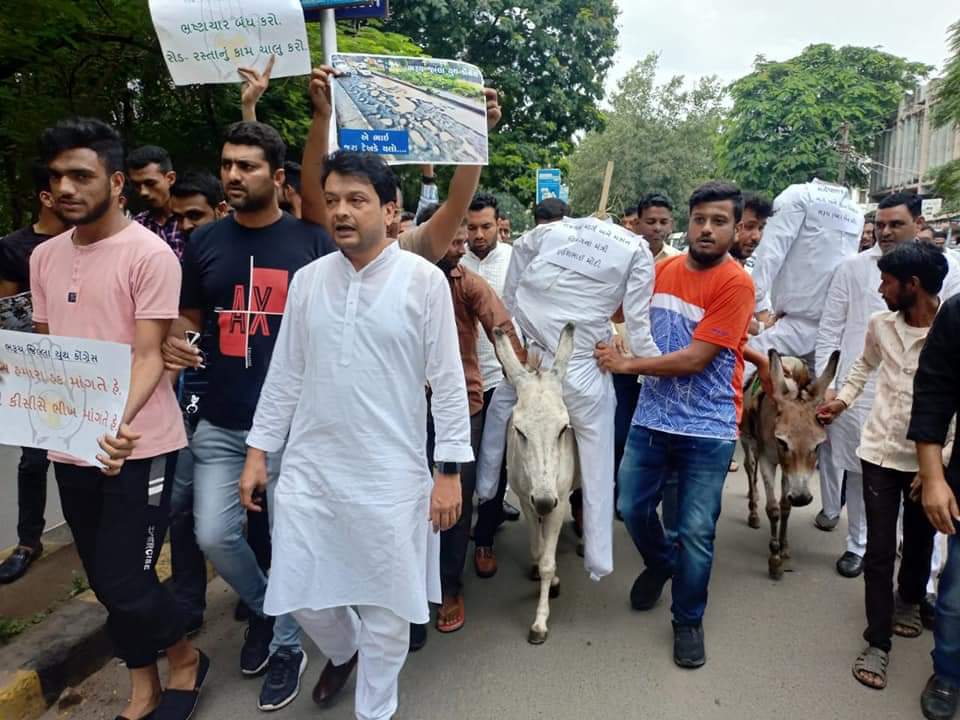 - માર્ગ મકાન મંત્રી પૂર્ણેશ મોદી અને કાર્યપાલક ઇજનેરના પૂતળા ગદર્ભ ઉપર બેસાડી શહેરમાં ફેરવ્યા.